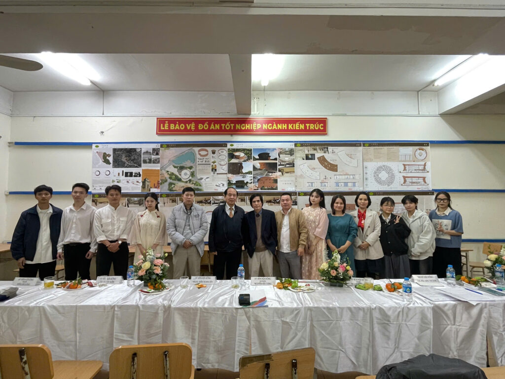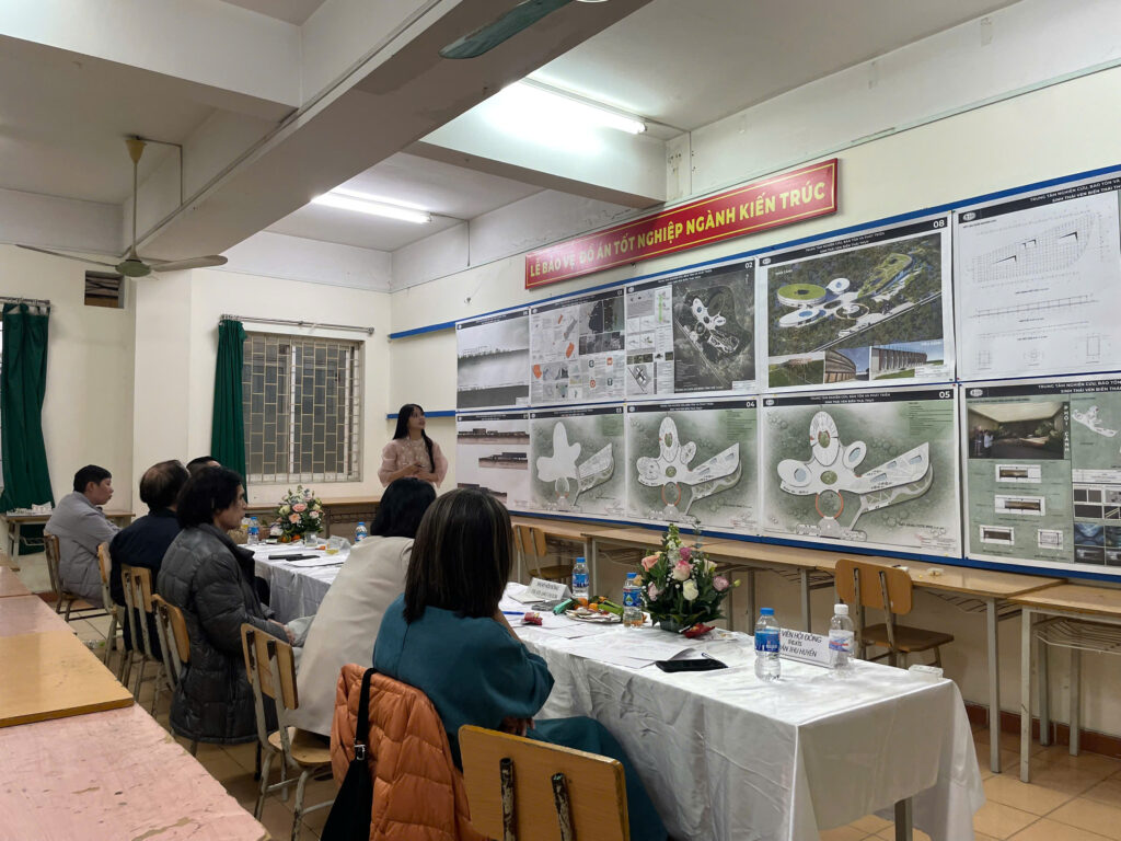 Buổi bảo vệ diễn ra trong không khí nghiêm túc, khoa học nhưng cởi mở và giàu tính học thuật. Hội đồng chấm đồ án đã đưa ra nhiều ý kiến đánh giá, phản biện sắc sảo và mang tính xây dựng, tập trung vào ý tưởng chủ đạo, tổ chức không gian, giải pháp kiến trúc – kỹ thuật cũng như tính khả thi của công trình. Chính những trao đổi chuyên môn thẳng thắn này đã giúp sinh viên nhìn nhận lại đồ án của mình một cách toàn diện, từ đó hoàn thiện tư duy nghề nghiệp trước khi bước vào thực tiễn.