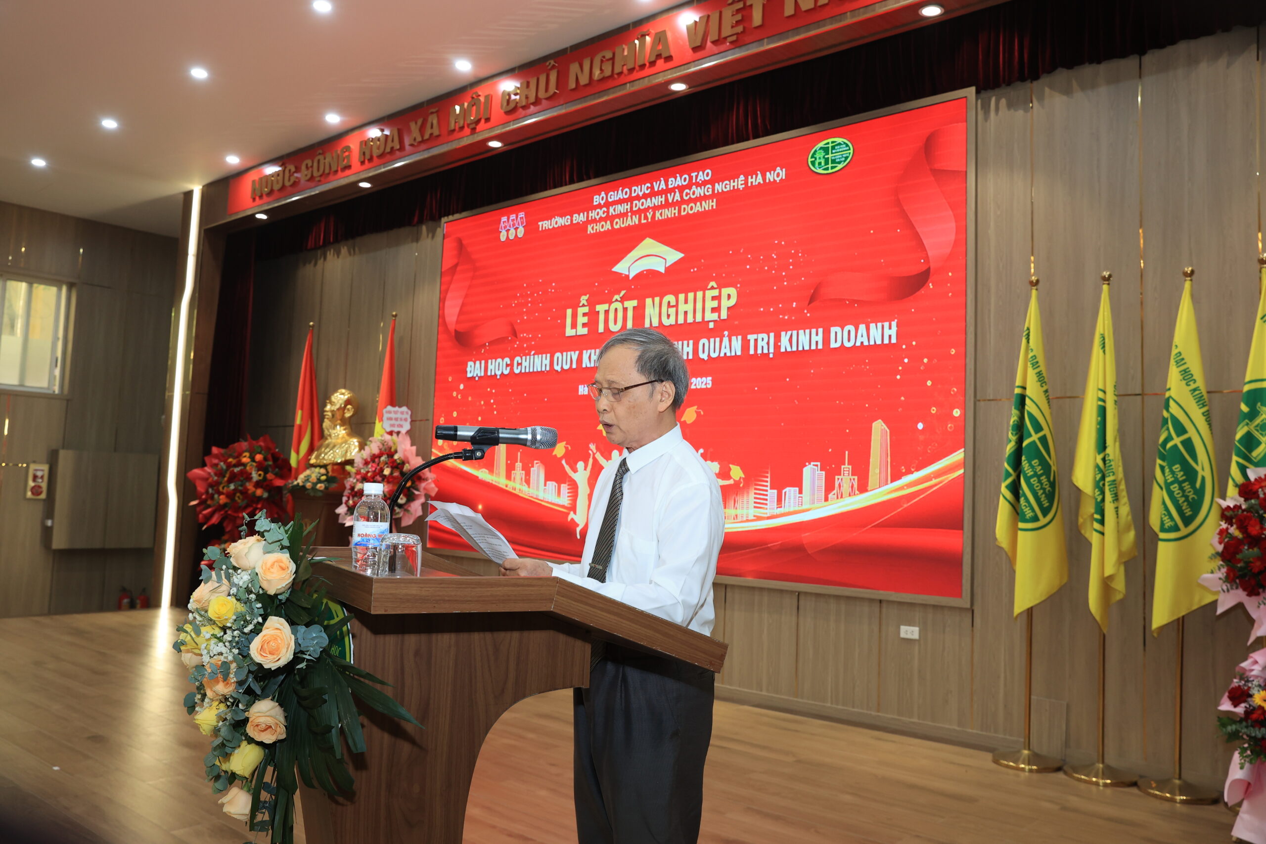 PGS.TS. Từ Quang Phương – Phó Chủ nhiệm phụ trách Khoa Quản lý Kinh doanh đã trình bày báo cáo tổng kết khóa học 2021–2025, nhìn lại toàn bộ quá trình đào tạo và thành quả mà thầy trò khoa đã đạt được. Bốn năm học không chỉ là thời gian tích lũy tri thức mà còn là hành trình rèn luyện bản lĩnh, hình thành nhân cách và định hướng nghề nghiệp cho sinh viên. Lời phát biểu của Thầy đã để lại nhiều xúc động trong lòng người tham dự.