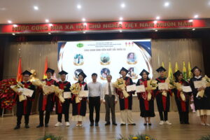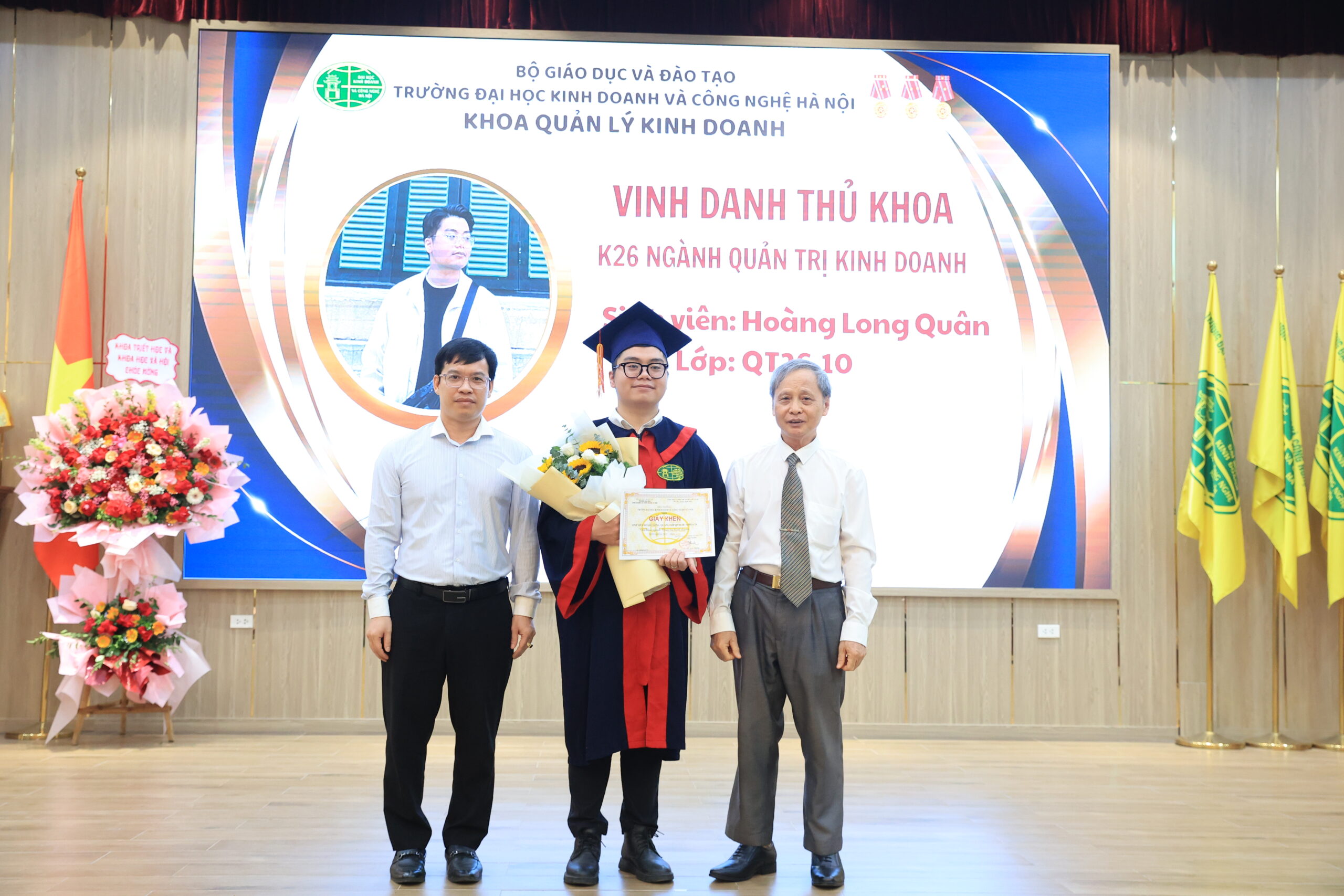 Một trong những khoảnh khắc được mong chờ nhất là công bố quyết định tốt nghiệp và khen thưởng. 9 sinh viên xuất sắc được vinh danh, trong đó bạn Hoàng Long Quân – lớp QT26.10 vinh dự trở thành tân thủ khoa ngành Quản trị Kinh doanh.