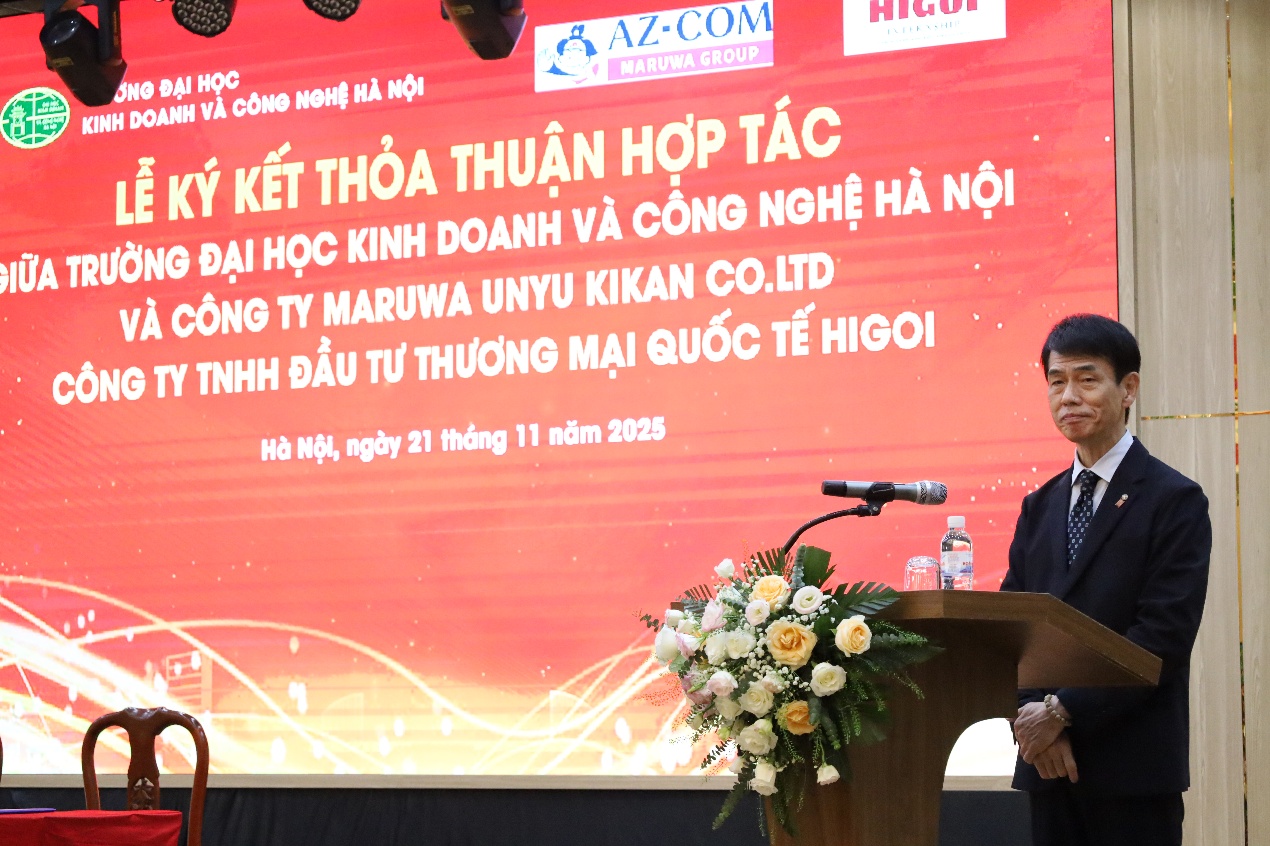 Tại lễ ký, Ông Kohei Hayakawa – Giám đốc nhân sự Tập đoàn Maruwa Unyu Kikan cảm ơn sự đón tiếp nồng hậu của Nhà trường dành cho đoàn công tác, đồng thời trình bày khái quát về lịch sử hình thành, sự phát triển của tập đoàn cũng như chương trình hợp tác điển hình với Khoa Thương mại trong đào tạo thực tập và cung cấp nguồn nhân lực cho tập đoàn. Ông đánh giá cao quy mô, tiềm năng phát triển của Nhà trường, đồng thời bày tỏ niềm vui khi Maruwa Unyu Kikan được hợp tác với Trường Đại học Kinh doanh và Công nghệ Hà Nội. Ông khẳng định, Tập đoàn Maruwa Unyu Kikan sẽ luôn dành sự quan tâm đặc biệt dành cho sinh viên của trường, giúp các bạn tự tin trong quá trình thực tập tại tập đoàn, vững bước lập nghiệp tương lai.