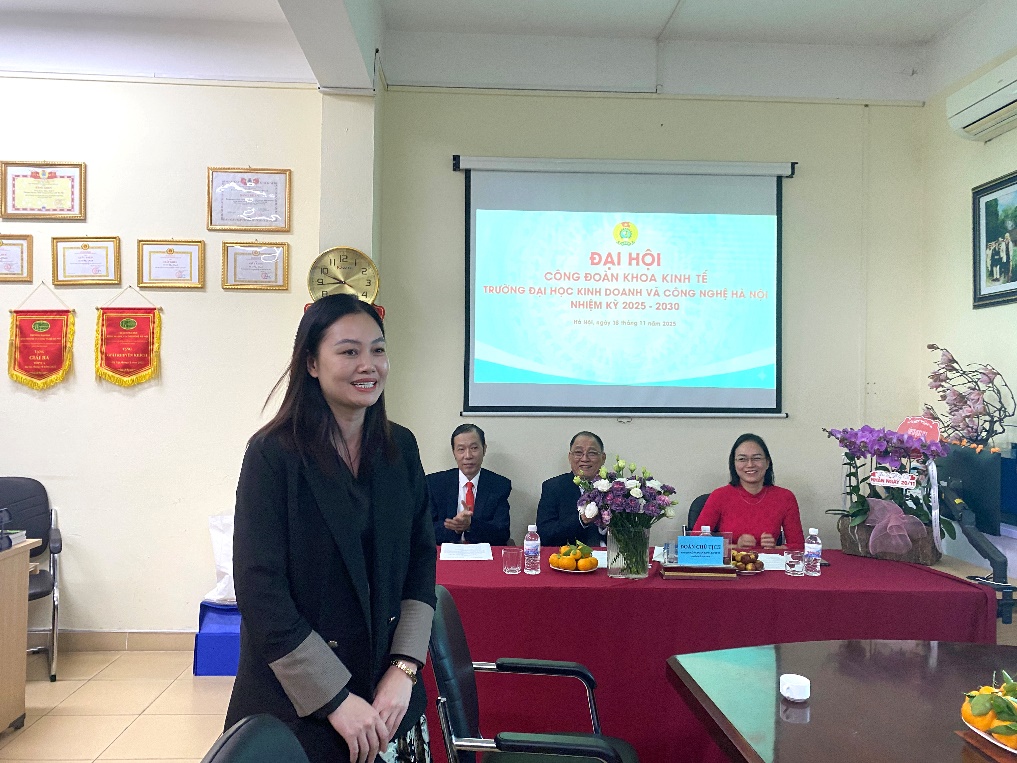 Phát biểu chỉ đạo tại Đại hội, TS. Nguyễn Thị Vân Khánh – Ủy viên Ban chấp hành Công đoàn Trường ghi nhận và biểu dương những kết quả mà công đoàn khoa Kinh tế đã đạt được trong nhiệm kỳ qua. Tập thể công đoàn đã phối hợp chặt chẽ với lãnh đạo đơn vị, chăm lo tốt đời sống vật chất – tinh thần cho cán bộ, viên chức; phát động nhiều phong trào thi đua thiết thực, hiệu quả; kịp thời nắm bắt tâm tư, nguyện vọng của đoàn viên và xây dựng một môi trường làm việc đoàn kết, nhân văn, chuyên nghiệp.
