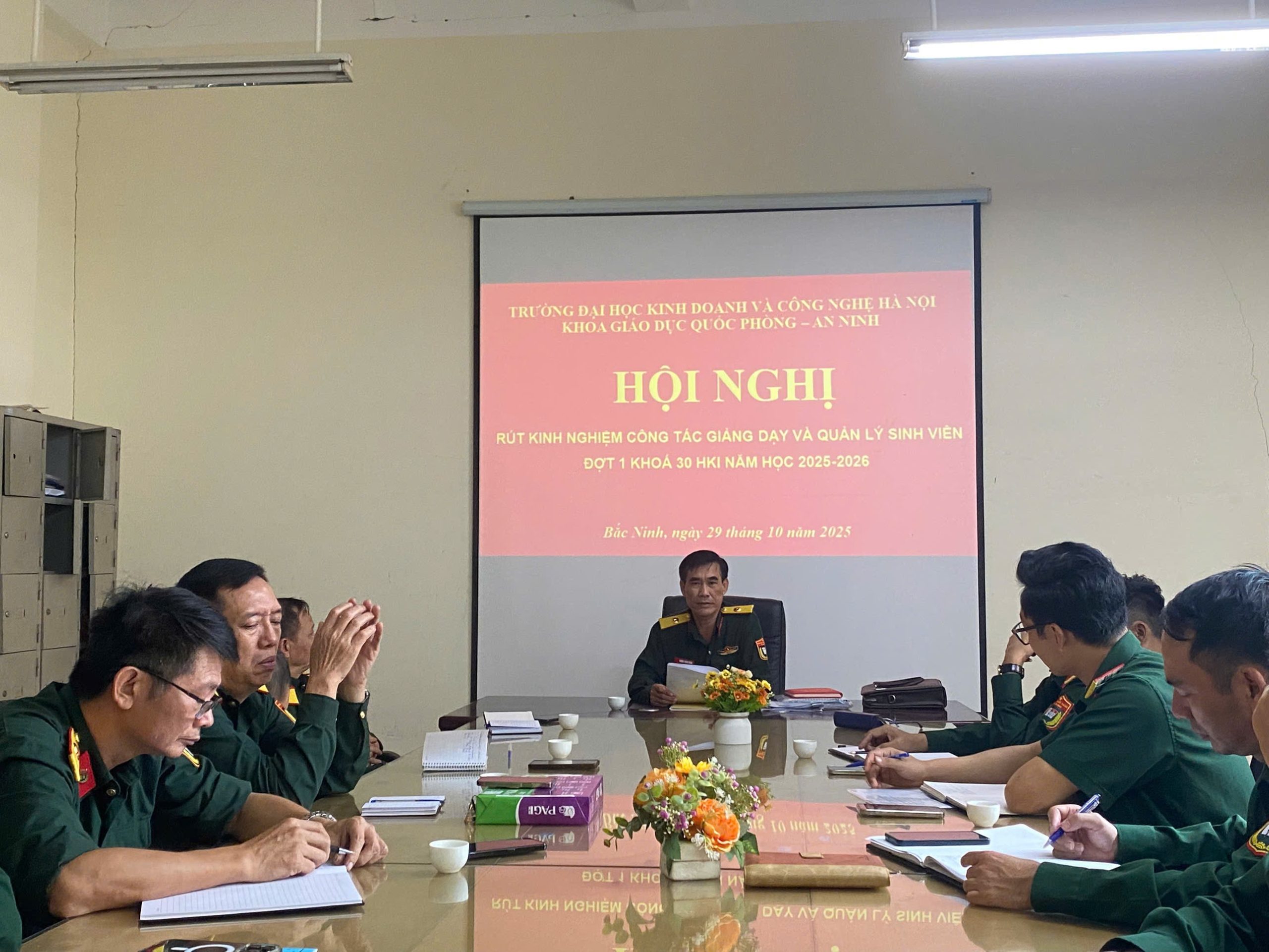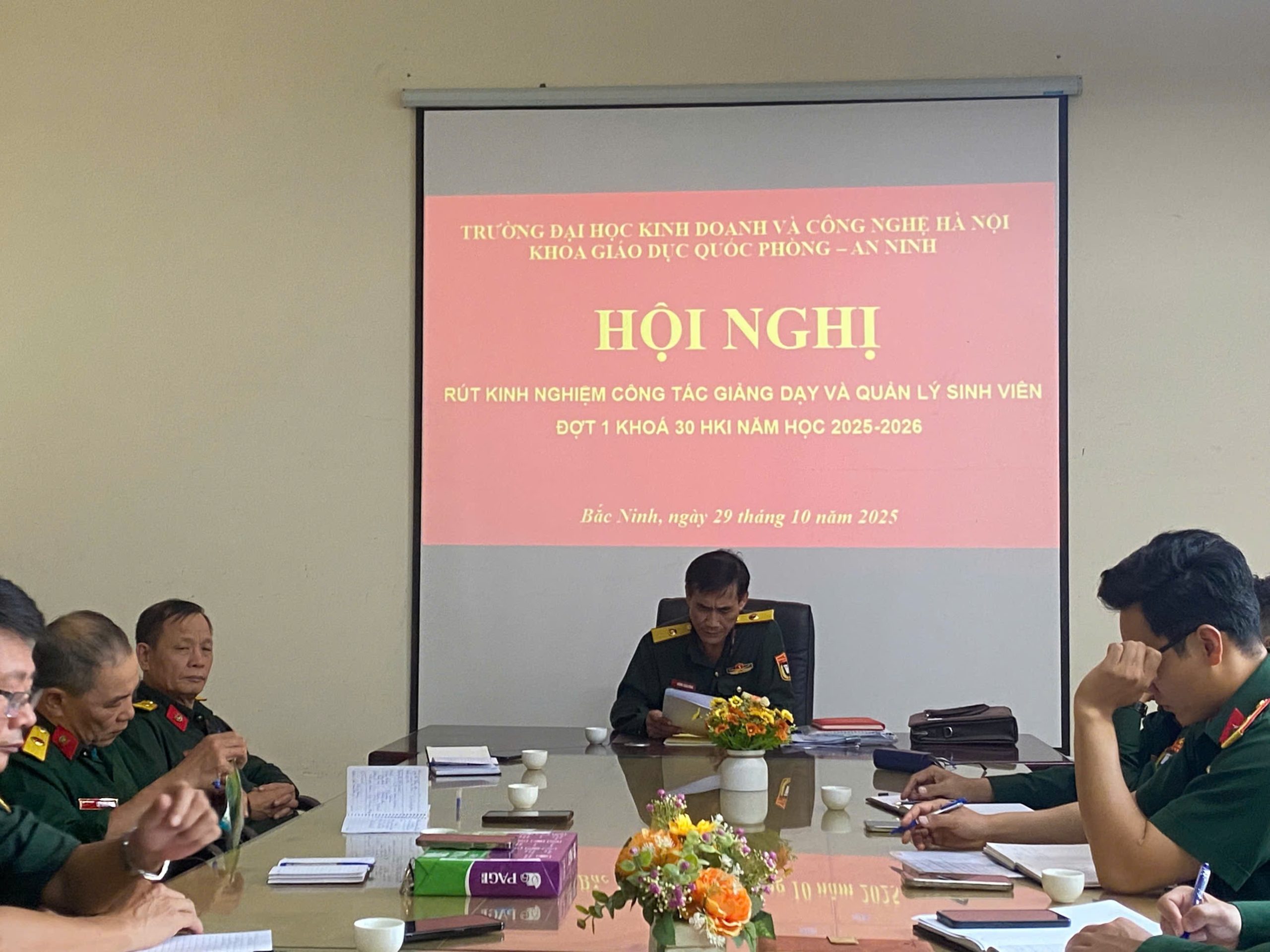 Ngày 29/10/2025, tại cơ sở 2 – Từ Sơn, Khoa Giáo dục Quốc phòng – An ninh (GDQP-AN) – Trường Đại học Kinh doanh và Công nghệ Hà Nội đã tổ chức Hội nghị rút kinh nghiệm công tác giảng dạy và quản lý sinh viên đợt 1 Khóa 30 học tập trung (nội trú) 4 tuần.
