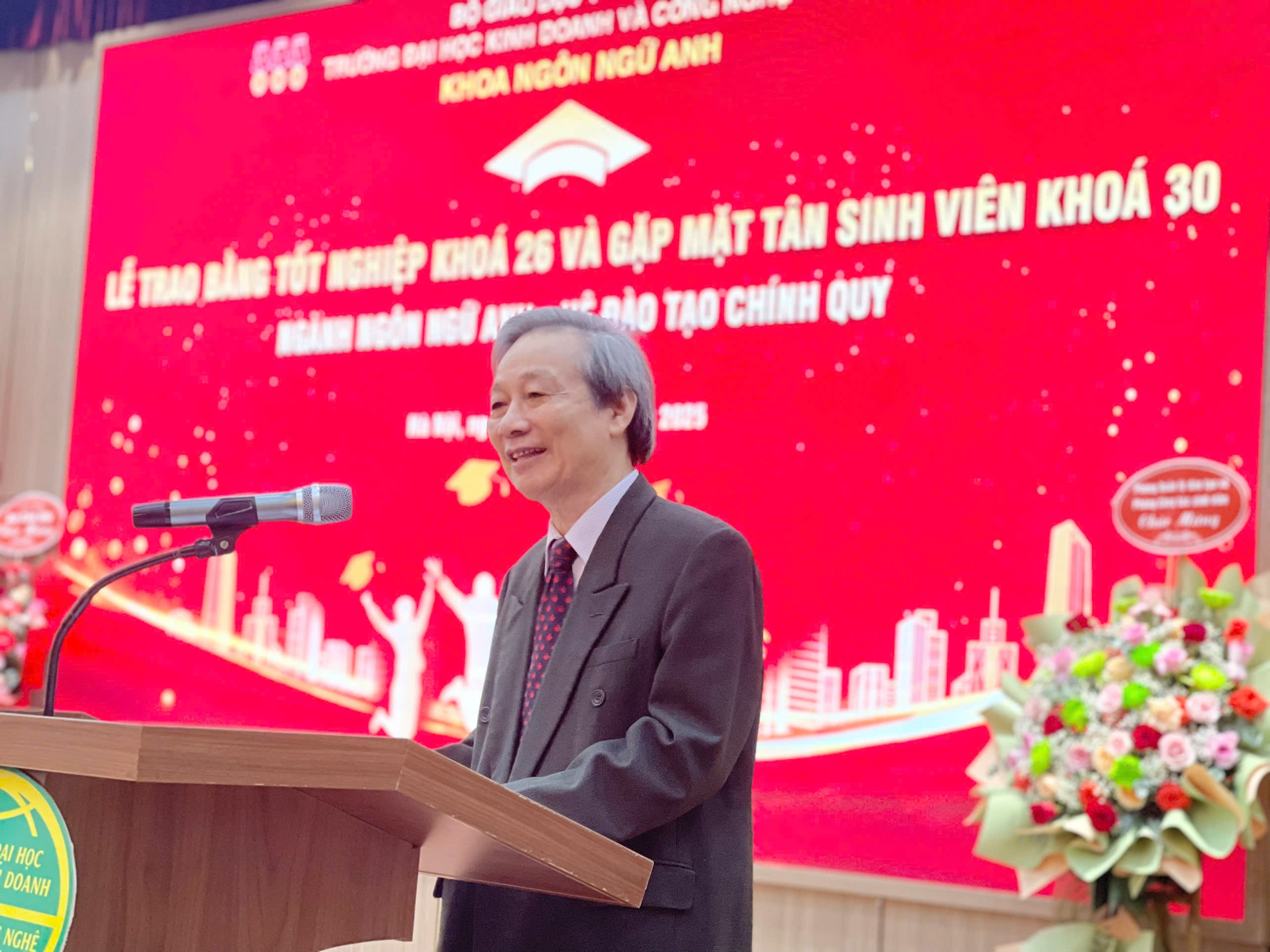 PGS.TS. Phan Văn Quế bày tỏ niềm vui, sự tự hào và lời chúc mừng đối với các tân cử nhân khóa 26, đồng thời căn dặn các tân cử nhân hãy tiếp tục phấn đấu, trau dồi thêm nhiều kiến thức để vững bước lập nghiệp tương lai, góp phần làm rạng danh Khoa Ngôn ngữ Anh nói riêng và Trường Đại học Kinh doanh và Công nghệ Hà Nội nói chung.