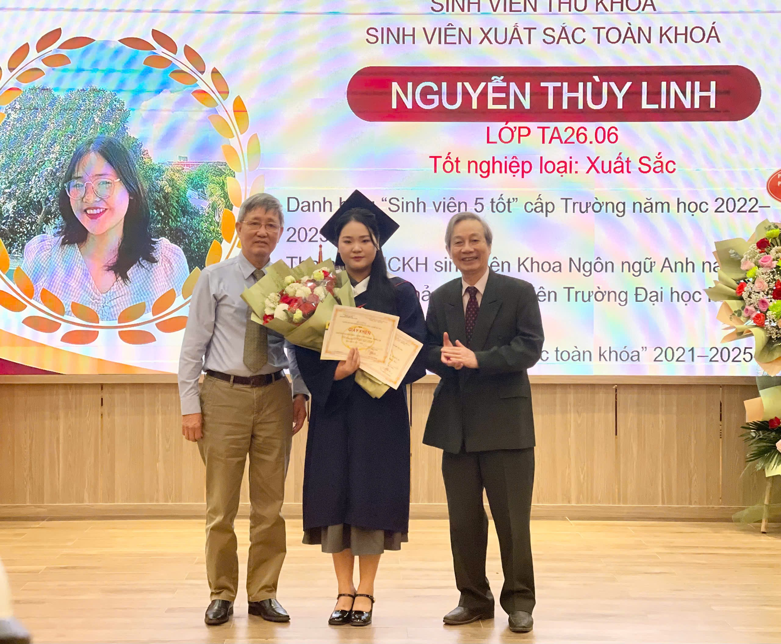 Ông Nguyễn Như Ngọc, Phó Trưởng phòng Quản lý Đào tạo và PGS.TS. Phan Văn Quế, Chủ nhiệm Khoa Ngôn ngữ Anh trao giấy khen cho Tân thủ khoa