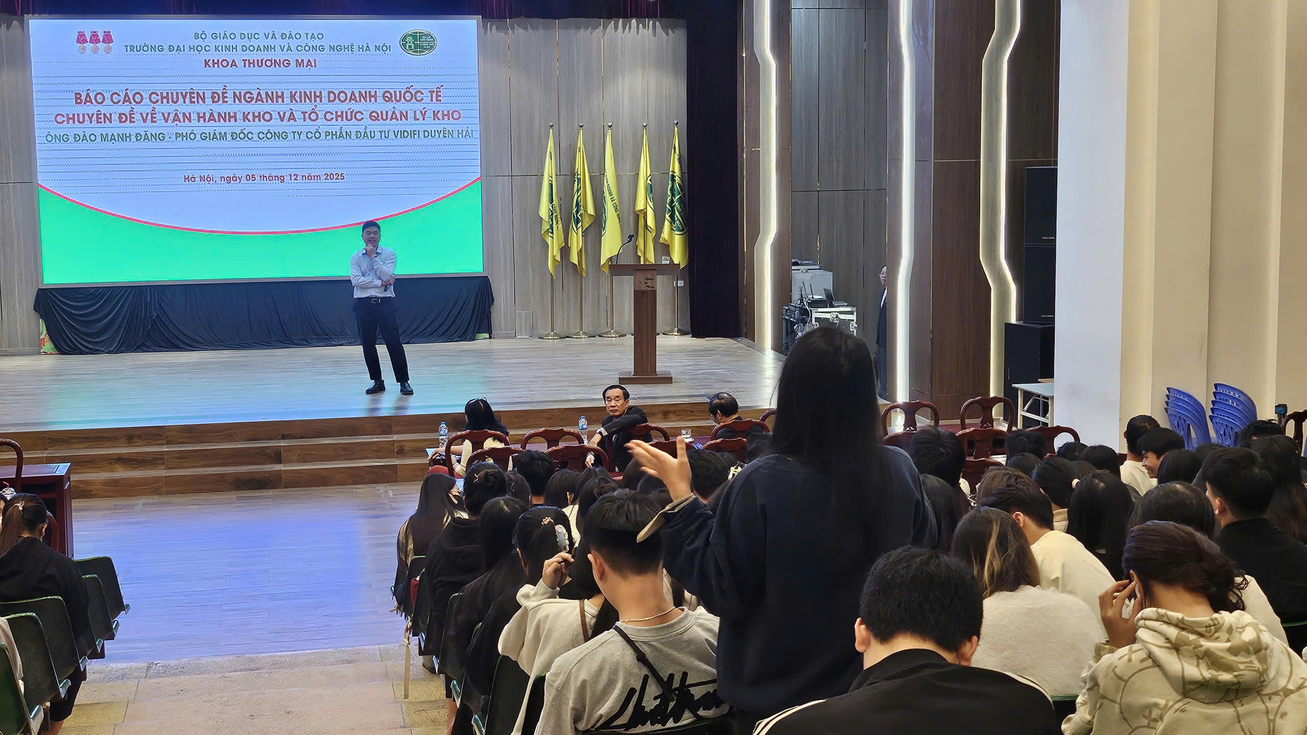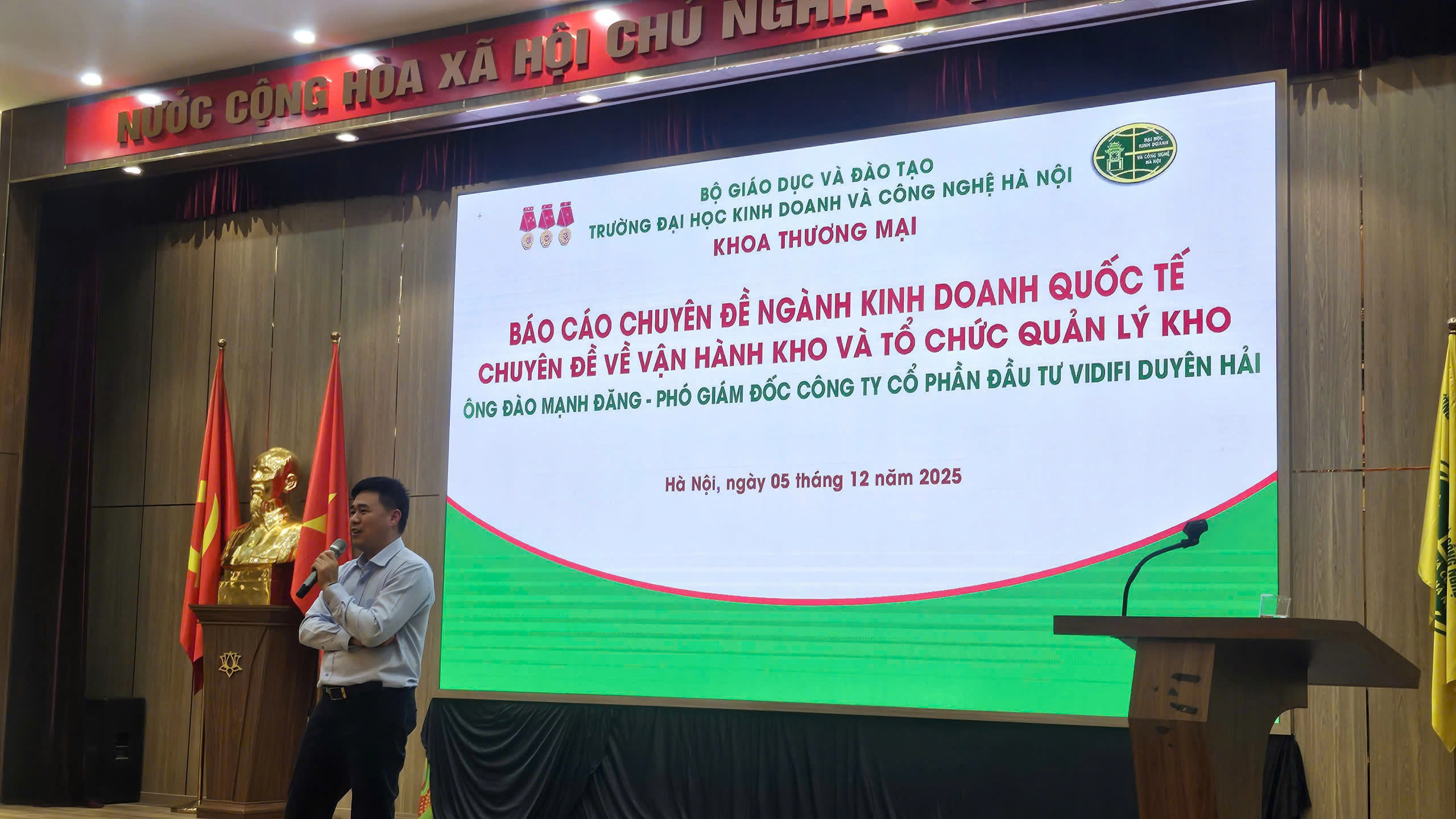 Chiều ngày 05/12/2025, tại Hội trường B, Khoa Thương mại – Trường Đại học Kinh doanh và Công nghệ Hà Nội đã tổ chức buổi báo cáo chuyên đề với nội dung: “Vận hành kho và tổ chức quản lý kho”.