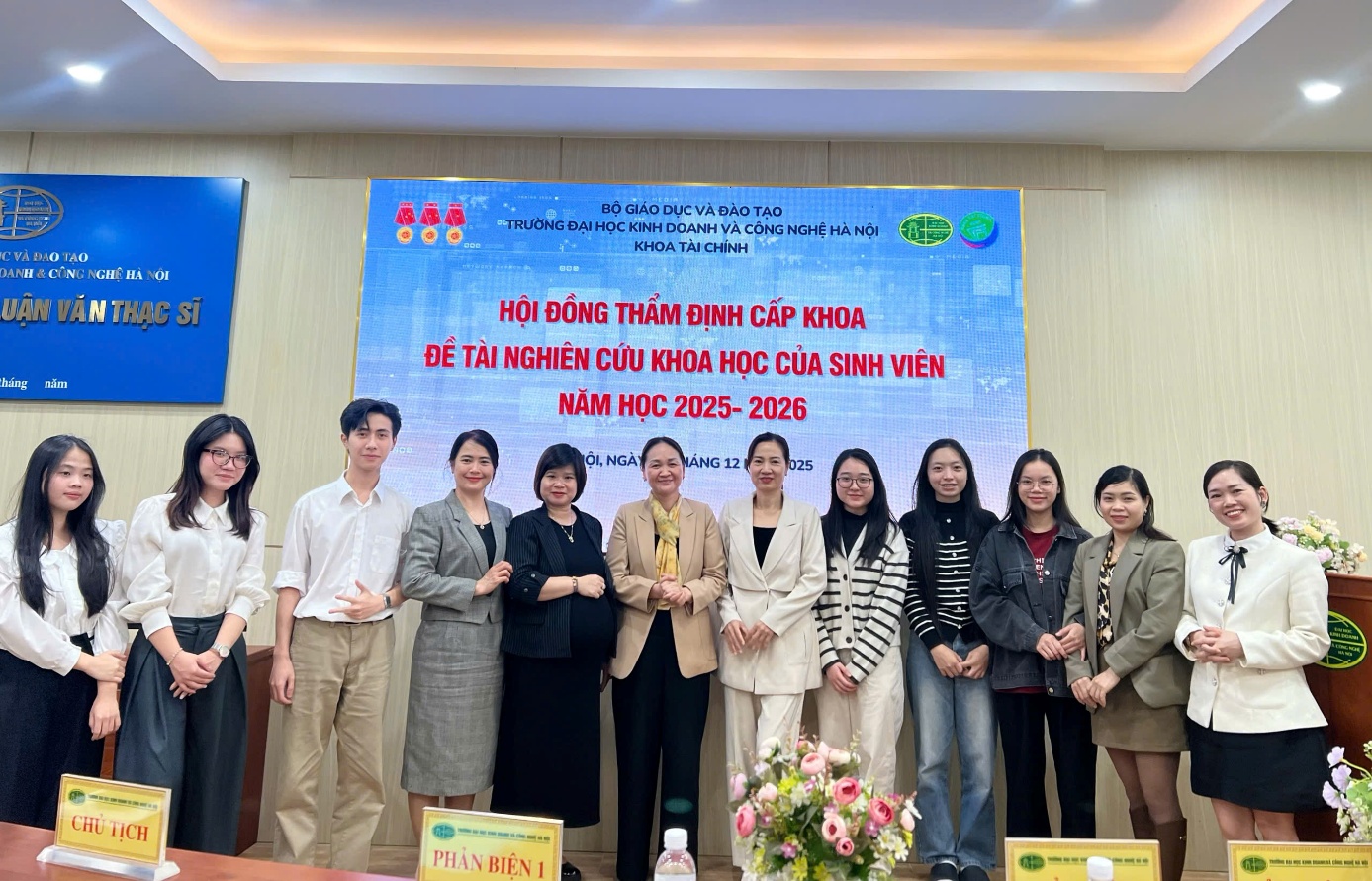 Chiều ngày 04/12/2025, Khoa Tài chính – Trường Đại học Kinh doanh và Công nghệ Hà Nội (HUBT) đã tổ chức Hội đồng thẩm định cấp Khoa đối với các đề tài nghiên cứu khoa học (NCKH) của sinh viên năm học 2025–2026. Đây là hoạt động thường niên có ý nghĩa quan trọng trong việc đánh giá chất lượng các công trình nghiên cứu của sinh viên trước khi xem xét trình cấp Trường. Buổi thẩm định diễn ra trong không khí nghiêm túc, khoa học, thể hiện sự quan tâm sâu sắc của Khoa đối với việc phát triển năng lực nghiên cứu của người học trong giai đoạn giáo dục đại học có nhiều chuyển biến mạnh mẽ. Khoa Tài chính luôn xác định NCKH là một trong những trụ cột quan trọng nhằm nâng cao chất lượng đào tạo. Hoạt động này không chỉ là sân chơi trí tuệ cho sinh viên mà còn là môi trường để rèn luyện khả năng tư duy phản biện, kỹ năng phân tích và phương pháp luận nghiên cứu theo hướng chuyên nghiệp. Việc tham gia nghiên cứu sớm giúp sinh viên hình thành tư duy hệ thống, khả năng đặt vấn đề, xây dựng giả thuyết, thu thập và xử lý dữ liệu, cũng như phát triển các kỹ năng trình bày, lập luận và bảo vệ quan điểm. Đây là những năng lực cốt lõi giúp người học thích ứng với môi trường lao động hiện đại với nơi yêu cầu ngày càng cao về khả năng tự học, tự nghiên cứu và sáng tạo.