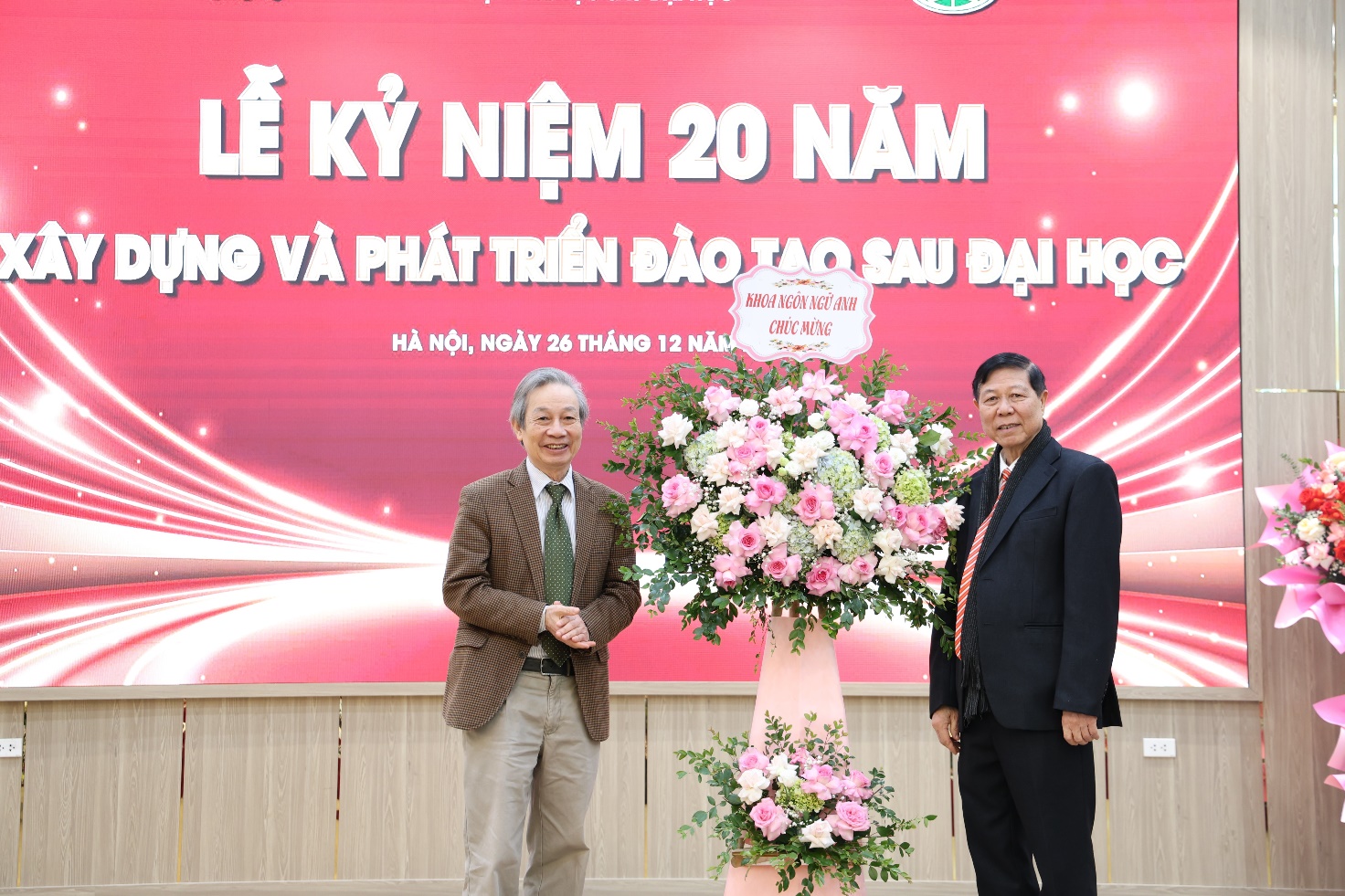 PGS.TS. Phan Văn Quế – Chủ nhiệm Khoa Ngôn ngữ Anh (bên trái) tặng hoa chúc mừng Viện Đào tạo Sau đại học