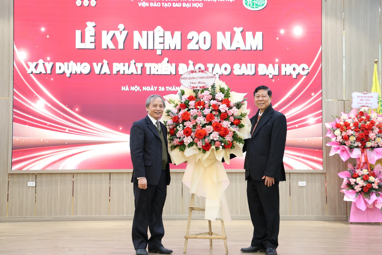 PGS.TS. Từ Quang Phương – PCN phụ trách Khoa Quản lý Kinh doanh (bên trái) tặng hoa chúc mừng Viện Đào tạo Sau đại học
