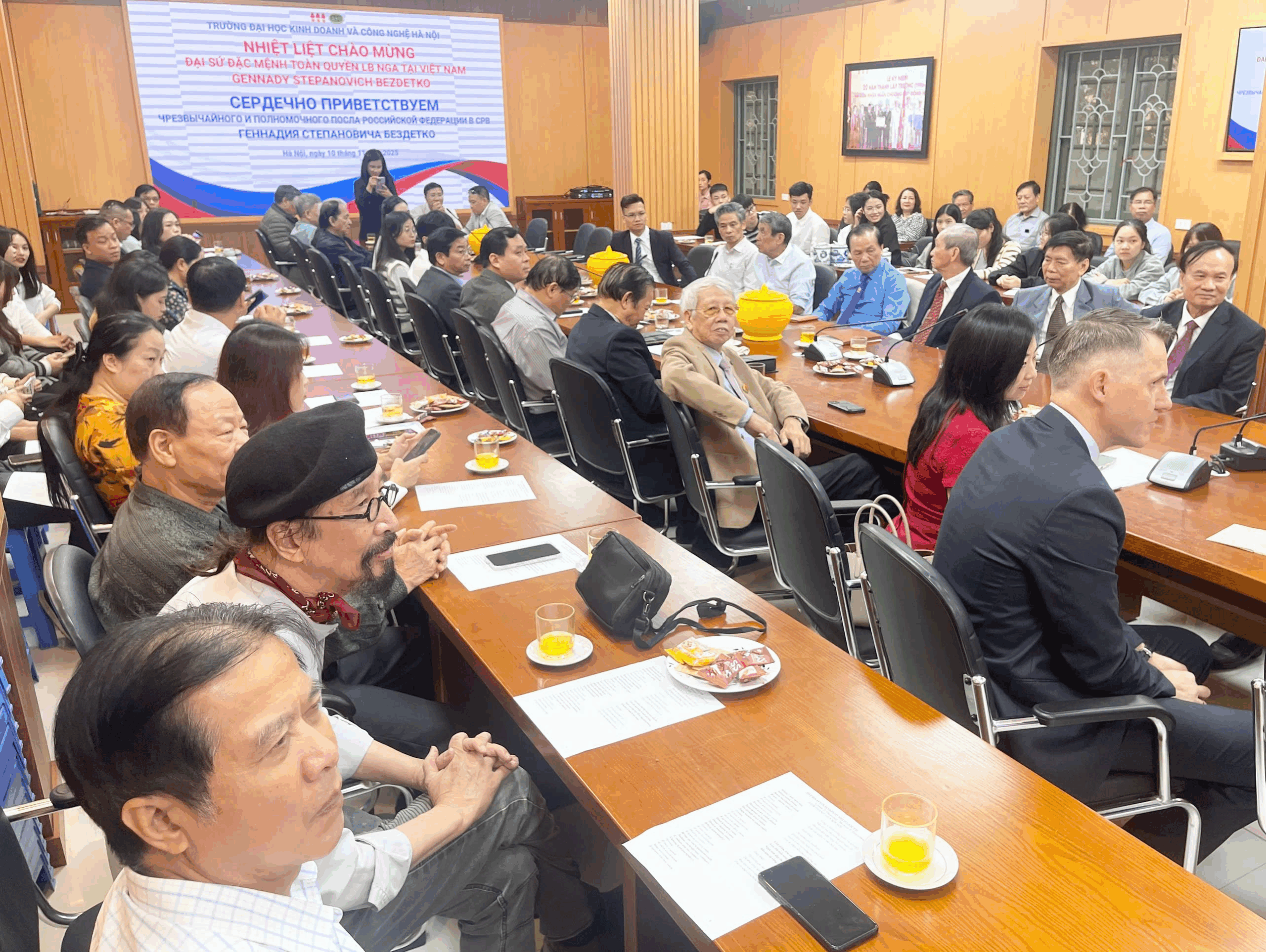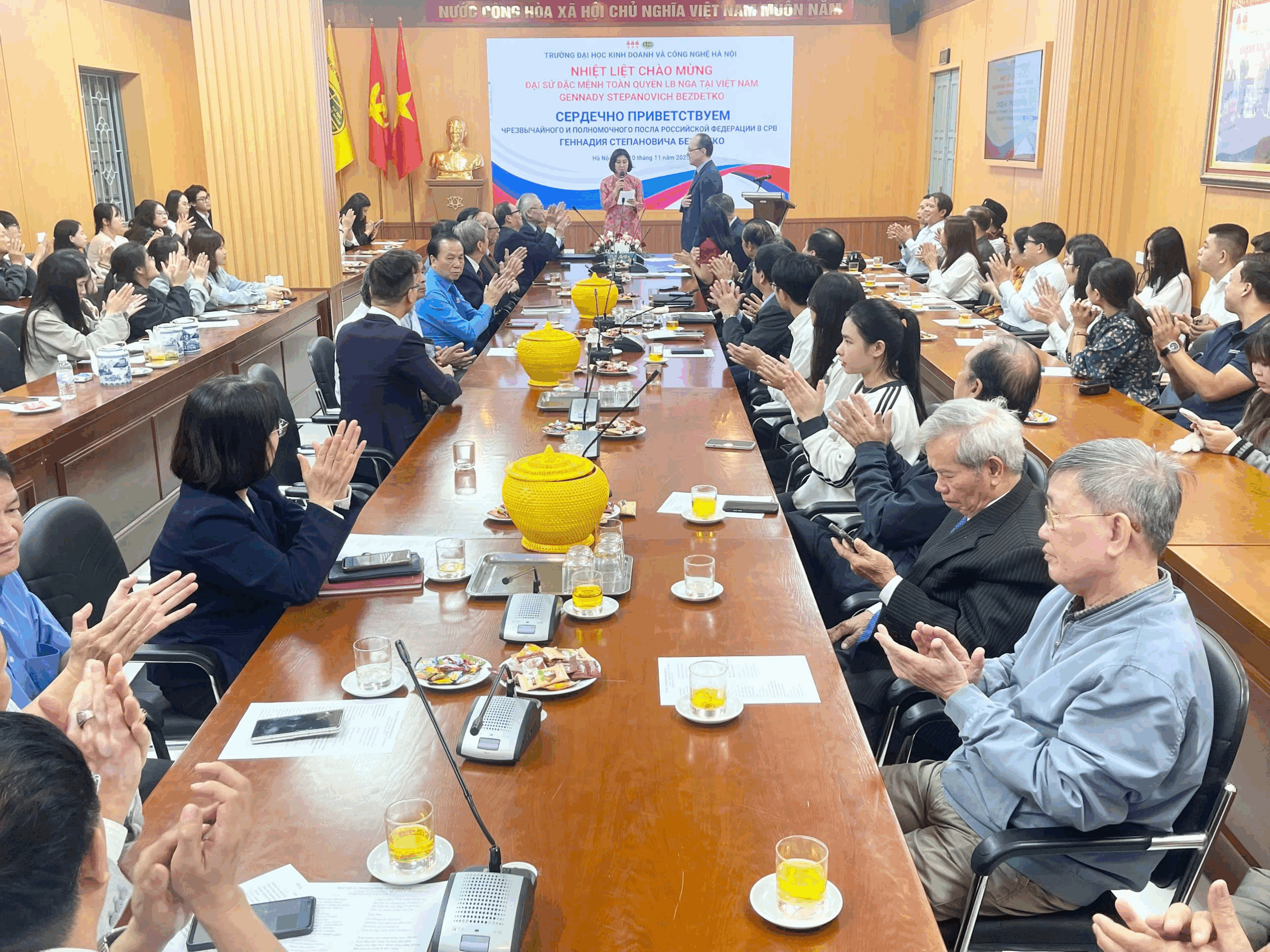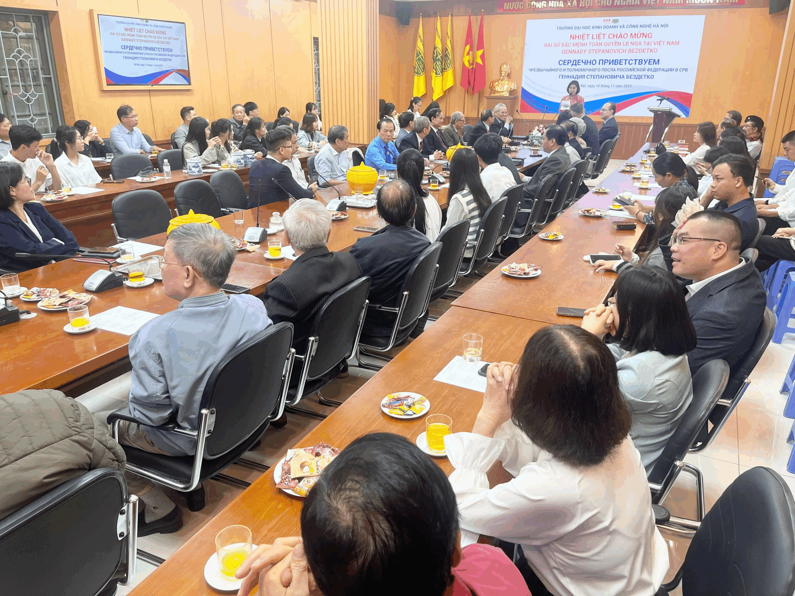 Chia sẻ với Ngài Đại sứ, Phó Hiệu trưởng Trần Đức Minh đã giới thiệu khái quát về lịch sử phát triển cùng những thành tựu nổi bật trong công tác đào tạo, nghiên cứu khoa học và hợp tác quốc tế của nhà trường cũng như nhiều thành tích trong đào tạo tiếng Nga cho sinh viên chuyên ngành Ngôn ngữ Nga – Hàn suốt thời gian qua. Phó Hiệu trưởng cũng cho biết, trong thời kỳ hội nhập quốc tế, Trường Đại học Kinh doanh và Công nghệ Hà Nội luôn duy trì và đảm bảo công tác tuyển sinh đào tạo ngành Ngôn ngữ Nga trong gần 30 năm qua, đồng thời tiếp tục mở rộng, tìm kiếm xây dựng quan hệ hợp tác với các đối tác quốc tế uy tín, trong đó có các cơ sở giáo dục của Liên bang Nga, nhằm đa dạng hóa và chuẩn hóa chất lượng quốc tế trong các chương trình đào tạo, mang lại nhiều cơ hội học tập hơn nữa cho sinh viên của nhà trường.